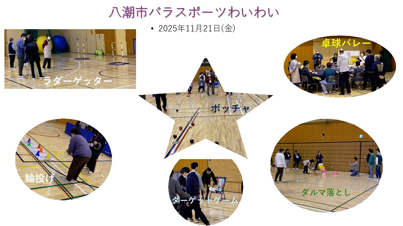 2025年11月21日 / 最終更新日 : 2026年1月16日 oyamada 活動紹介(東南部) 「わいわい」笑顔で楽しく競技に参加 ~ 八潮市パラスポーツわいわい(施設スポーツ交流会) ~ 令和7年11月21日(金) エイトアリーナ(八潮市鶴ヶ曽根体育館)にて、「八潮市パラスポーツわいわい(施設スポーツ交流会)」を行いました。 参加者(支援者・看護師 […]
